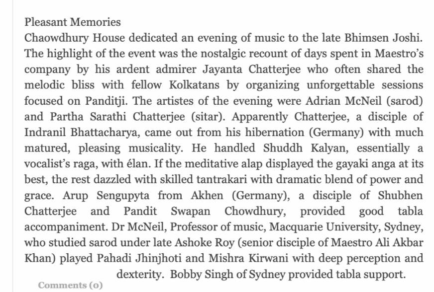 The sequences with unblemished tonality of his swaras (notes) revealed taste, an urge for expression and a feeling for tone modulations; a high sense of emotional vehemance … revealed a sensitive mind. And this in my opinion is of vital significance. The Hindu (New Delhi)